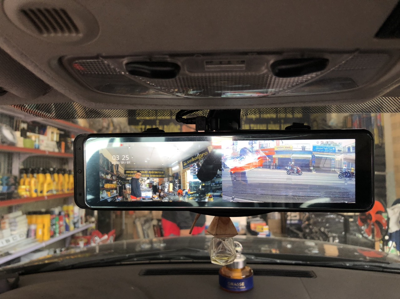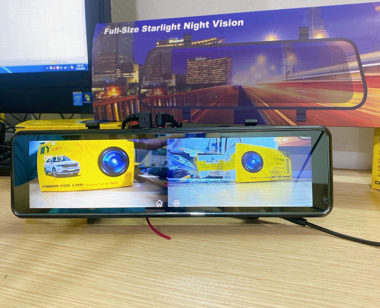 Camera hành trình ốp gương hậu màn hình rộng 10 inch, ghi hình trước và sau xe sắc nét, chức năng tự bật camera lùi khi gài số de an toàn.