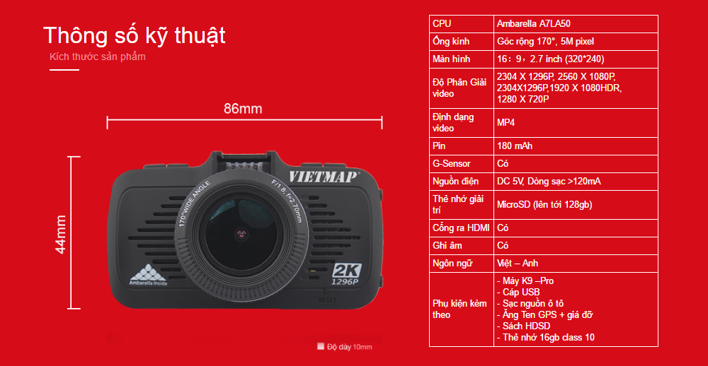 Camera hành trình VietMap K9 Pro ghi hình với độ phân giải 2K, cảm biến ma trận ghi hình cực rõ ban ngày, ban đêm, lấy nét biển số, ghi hình với thông tin tọa độ, bản đồ, tốc độ. Ngoài ra K9 pro còn có tính năng độc đáo cảnh báo thông tin giao thông bằng giọng nói mà không loại camera hành trình nào khác trên thị trường có được (Cảnh báo biển báo tốc độ, báo qua cầu\hầm\trạm thu phí, báo cấm vượt, khu dân cư....)