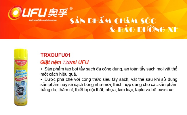 Chai xịt giặt nệm da UFU TRXOUFU01 (720ml) -> sản phẩm giúp taplo, tappi cửa, các phần nhựa nội thất ô tô.... tăng thêm độ sáng bóng, đồng thời có thêm chức năng ngăn ngừa lão hóa, mùi thơm dể chịu.