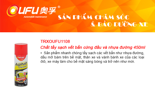 - Giải pháp đó là sử dụng Chất tẩy nhựa đường & vết bẩn cứng đầu UFU TRXOUFU1108 (450ml) -> sẽ giúp bạn dể dàng tẩy sạch các vết bám cứng đầu một cách nhanh chóng và hiệu quả. Đem lại sự sáng loáng, sạch sẽ như mới mà không mất quá nhiều chi phí và thời gian.
