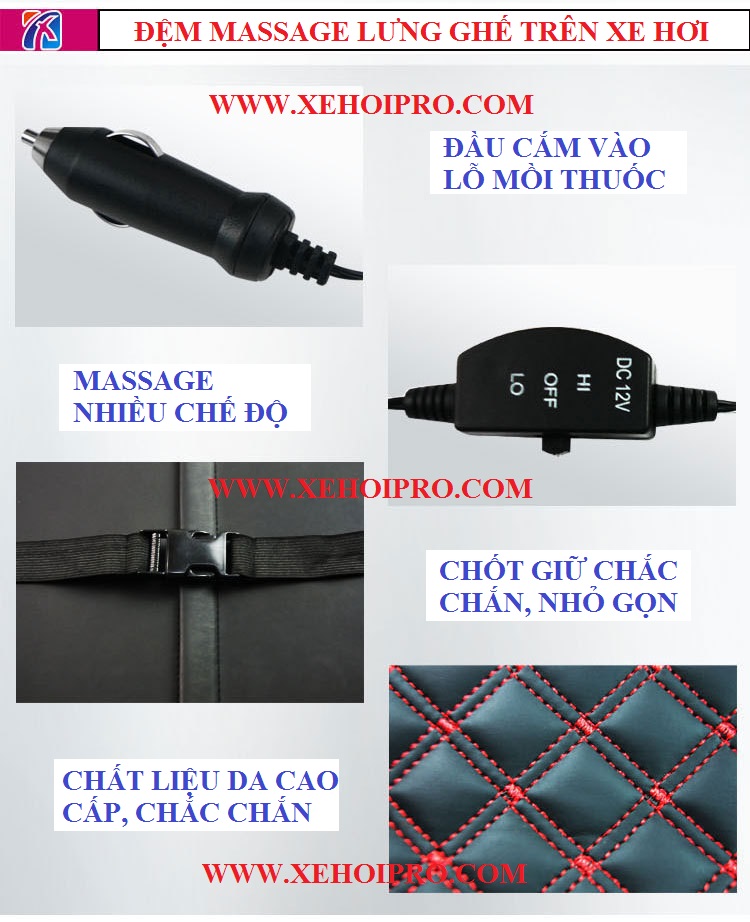 - Sản phẩm ứng dụng gắn trên tất cả loại ghế ngồi trên xe ô tô và ghế văn phòng, đệm massge được thiết kế với miếng đỡ bằng vật liệu cao cấp, có thể chỉnh theo vị trí ngồi, 1 tính năng đặc biệt là độ co giản của đệm giúp người ngồi thư giản tựa lưng massge bằng các đốt massge gắn trên đệm giúp thư giản giảm mệt mỏi, giảm tress khi đi du lịch đường dài hoặc ngồi lái xe lâu hay ngồi ghế văn phòng hàng giờ.