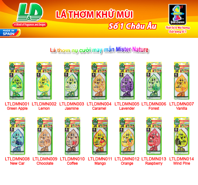 – Lá thơm hình nụ cười may mắn L&D LTLDMN001 có 14 mùi hương khác nhau: chanh, cam, táo, xoài, vani, lài, café, socola, caramen, xe mới, lavender, hương rừng, thông rừng, mâm xôi.