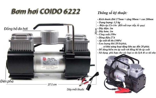 - Máy bơm lốp ô tô công suất lớn Coido MBC6222 (Đen bạc) với 2 pittong là một trong những dụng cụ có thương hiệu được người dùng ưa chuộng nhất hiện nay. Sản phẩm được sản xuất theo tiêu chuẩn quốc tế, chất lượng cao, dễ sử dụng, không gây nguy hiểm cho người dùng.