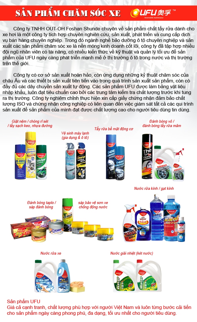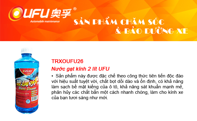 Nước rửa kính UFU TRXOUFU26 2L (dạng châm) với thành phần đặc biệt, giúp rửa bỏ nhanh chóng các vết bẩn bám trên kính ô tô như: phân chim, bụi bẩn, vết trái cây, ố nước mưa.....