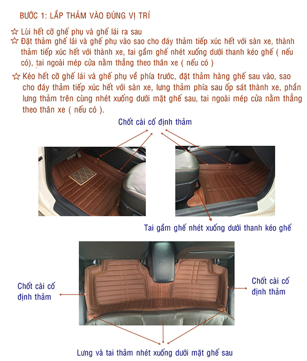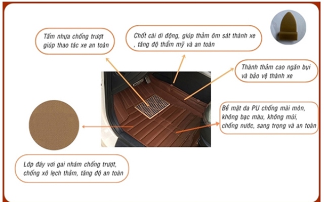 Sản phẩm được cắt may theo khuôn mẫu chính xác đến từng hãng xe và model xe riêng biệt làm cho thảm vừa khít với từng loại sàn xe, che phủ toàn bộ phần nỉ sàn xe nguyên bản làm cho nội thất chiếc xe trở sang trọng, đồng thời hạn chế tối đa các bụi bẩn bám vào phần nỉ ban đầu giúp cho công việc vệ sinh nội thất trở lên đơn giản hơn bao giờ hết. Rất nhiều màu sắc giúp sản phẩm phù hợp với mọi nội thất của chiếc xe của bạn.