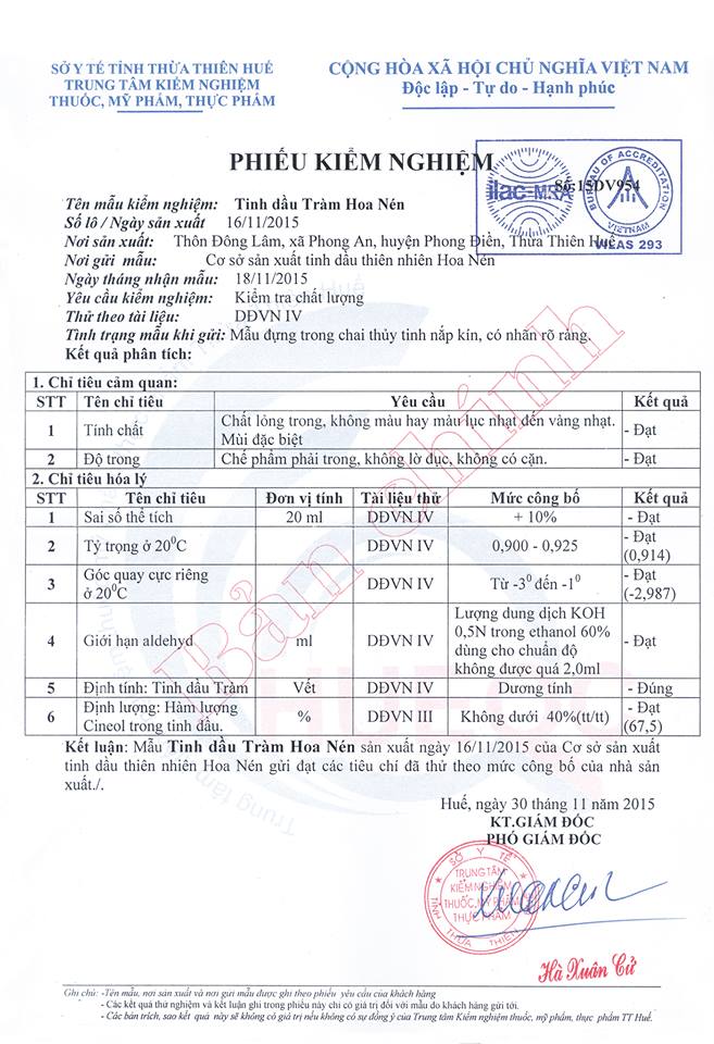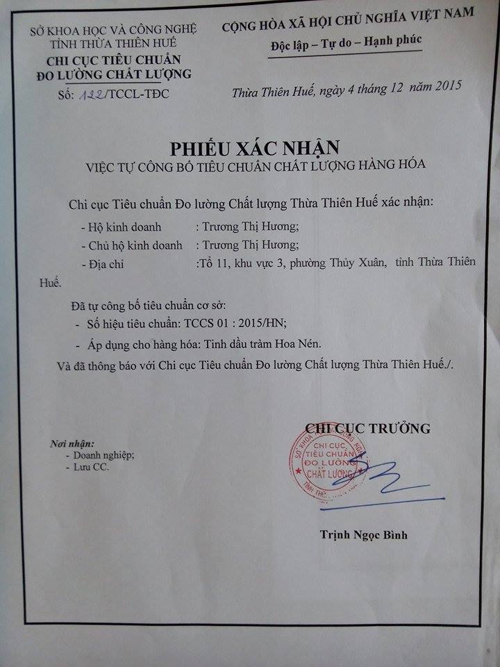 TINH DẦU HOA NÉN với hàm lượng cineol chiếm 67,5%, đã được Sở Y tế Thừa Thiên Huế kiểm định chất lượng và đã được Chi cục đo lường chất lượng – Sở KHCN xác nhận công bố chất lượng sản phẩm.