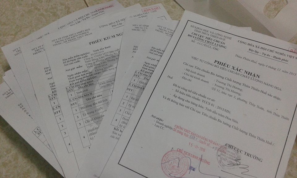 Sản phẩm có đầy đủ hồ sơ, bao gồm: kiểm định chất lượng do Sở Y tế Thừa Thiên Huế cấp, xác nhận công bố chất lượng sản phẩm của Chi Cục đo lường chất lượng – Sở Khoa học và Công nghệ tỉnh Thừa Thiên Huế cấp. Ngoài ra, sản phẩm cũng đã đăng ký và sử dụng mã vạch do Viện Tiêu chuẩn Chất lượng Việt Nam (GS1 Vietnam) cấp.